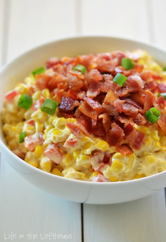 Confetti corn is colorful creamy corn with bacon and cream cheese. Life-in-the-Lofthouse.com   This week I’ll be sharing a new recipe every day! First up, this Creamy Confetti Corn. This corn is oh so good! 🙂